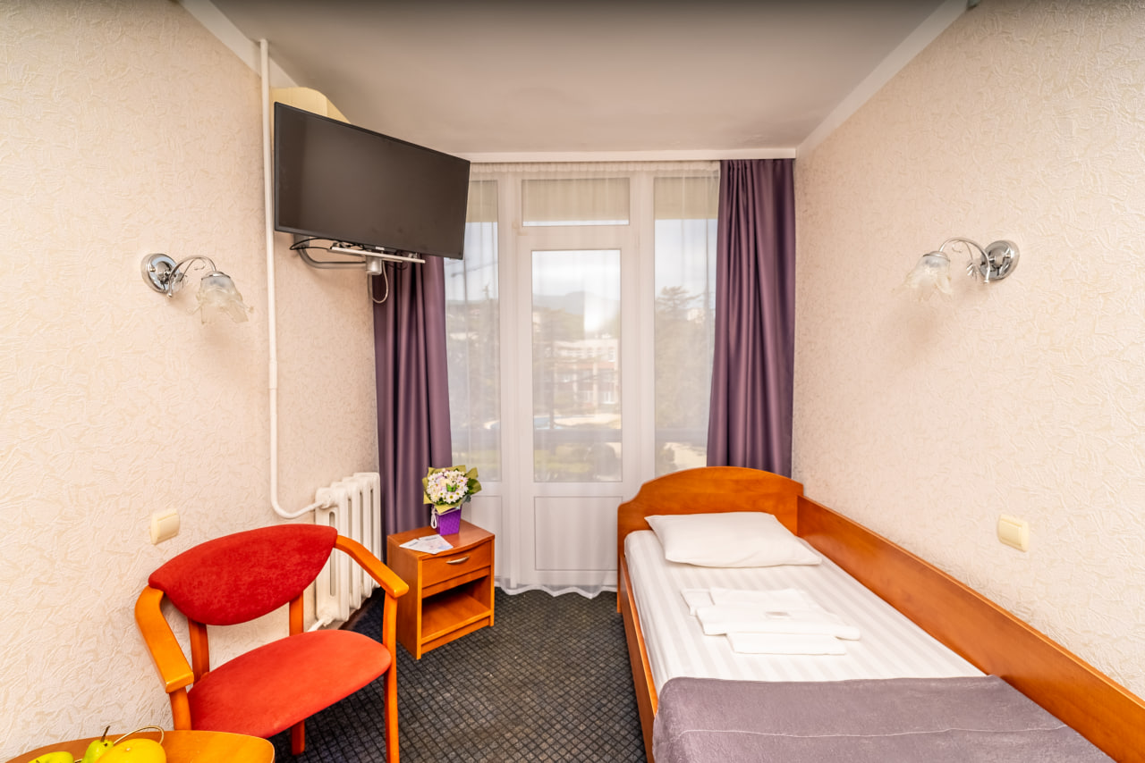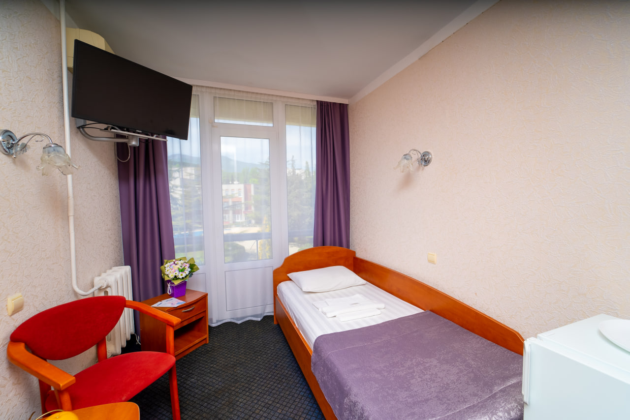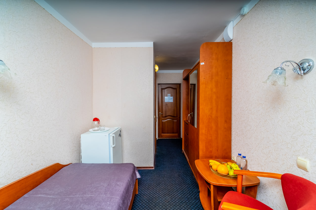 Площадь номера - 11-12 кв.м. 1 осн. место. Мебель: вешалка, зеркало, кровать односпальная, стол, стул, шкаф. Оборудование: кондиционер, телевизор, холодильник. Санузел: с душем, туалетные принадлежности. Сервис: Wi-Fi бесплатно, смена полотенец, смена постельного белья, уборка номера.
