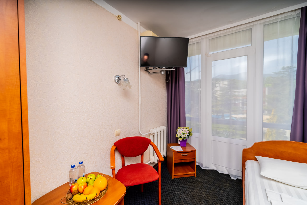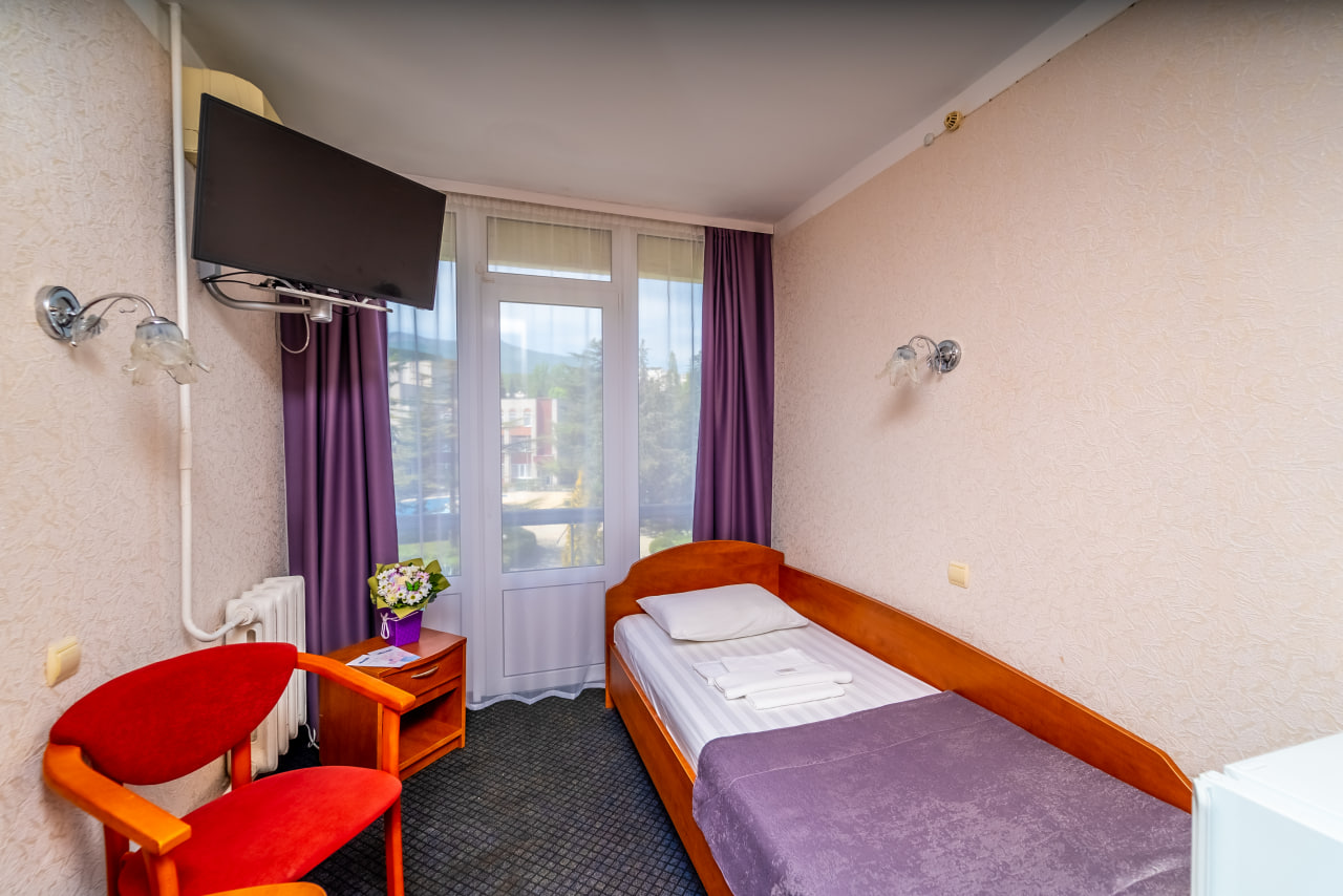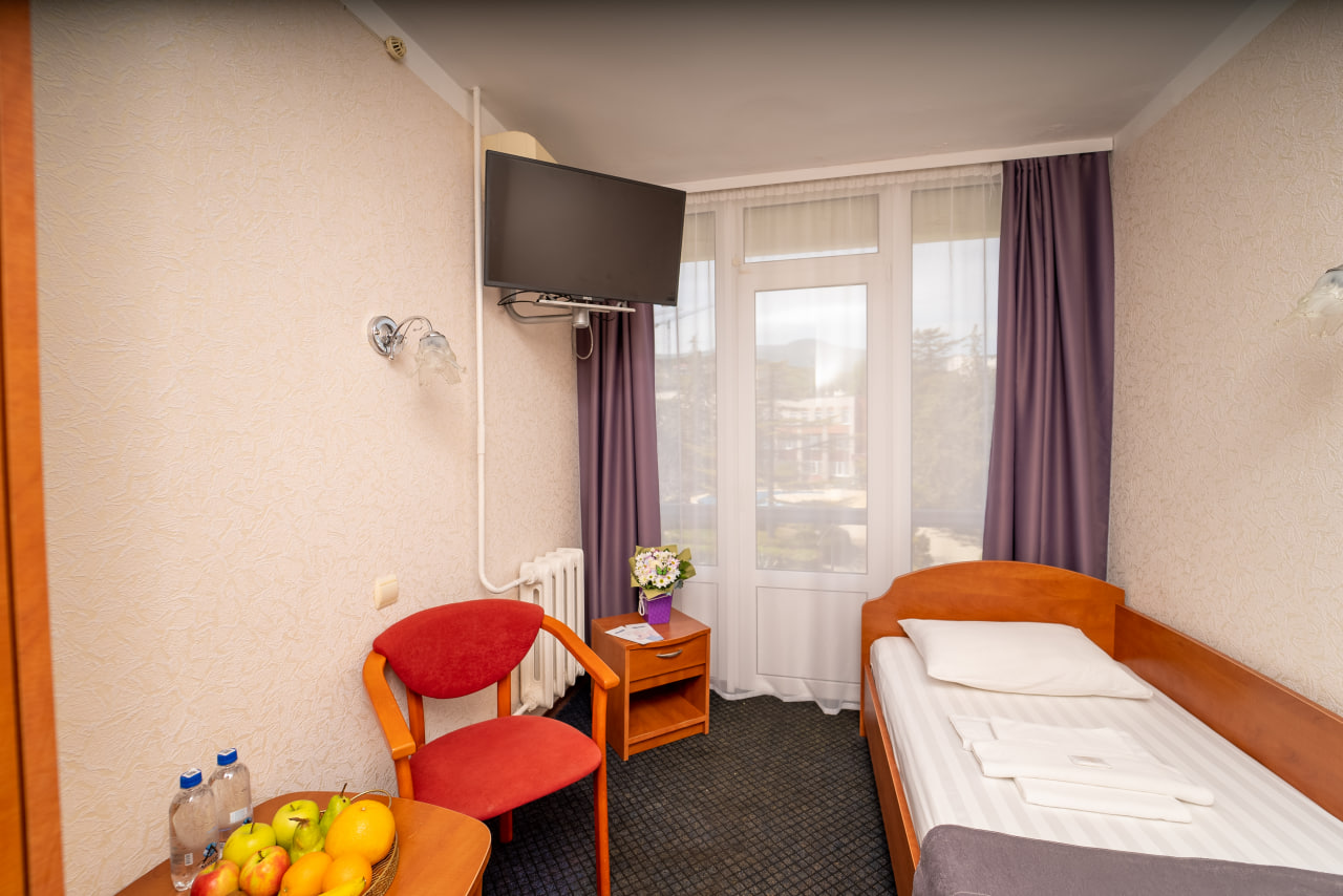 Площадь номера - 11-12 кв.м. 1 осн. место. Мебель: вешалка, зеркало, кровать односпальная, стол, стул, шкаф. Оборудование: кондиционер, телевизор, холодильник. Санузел: с душем, туалетные принадлежности. Сервис: Wi-Fi бесплатно, смена полотенец, смена постельного белья, уборка номера.