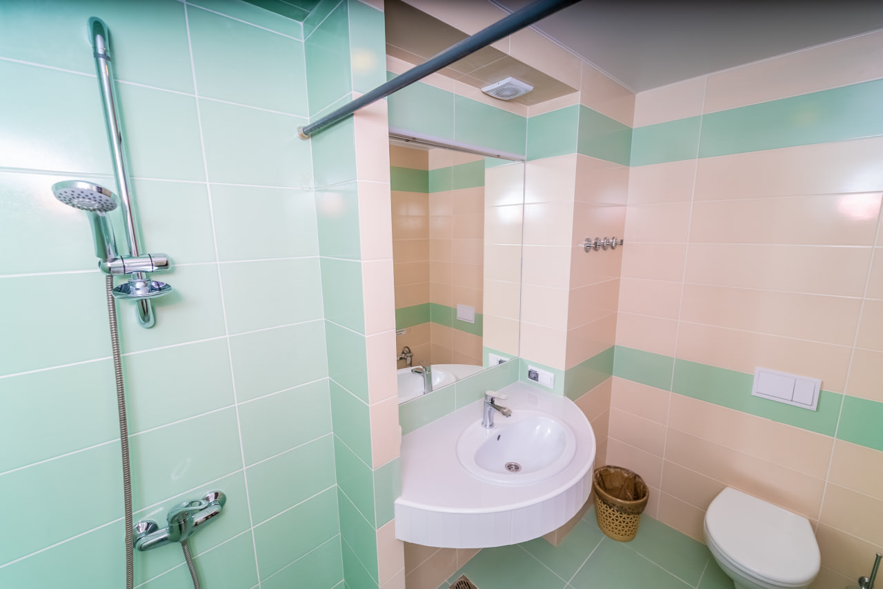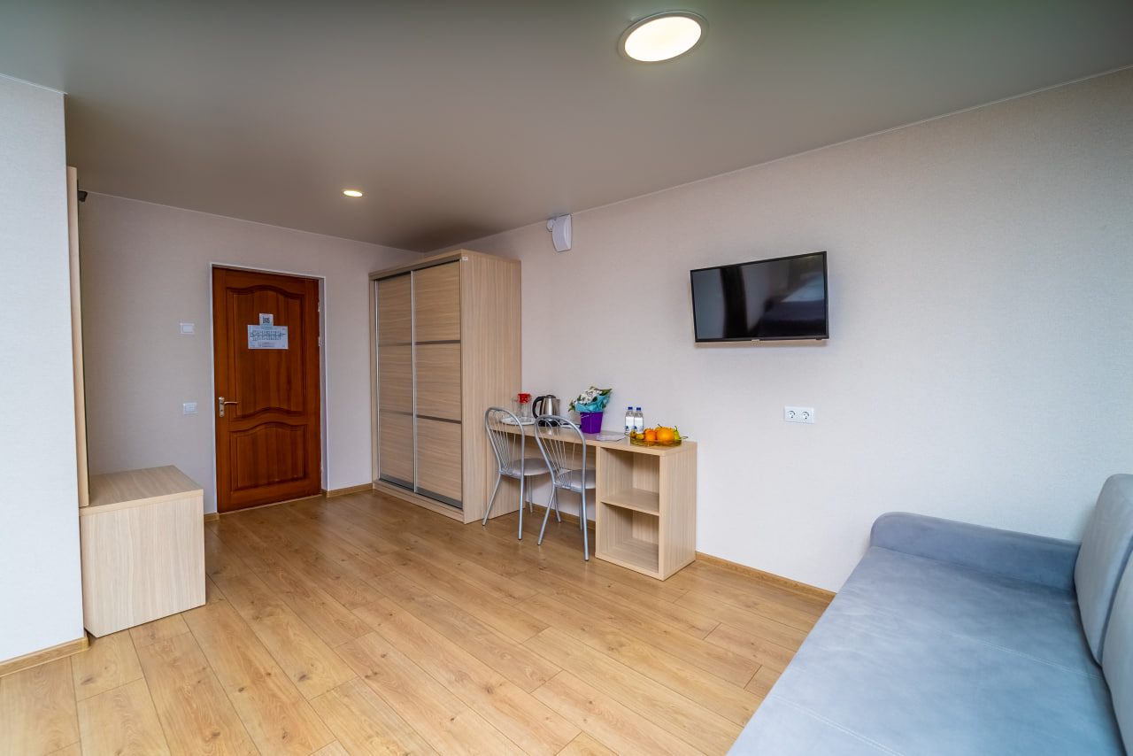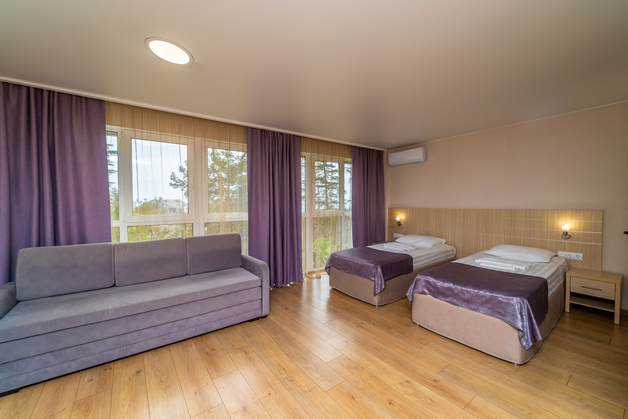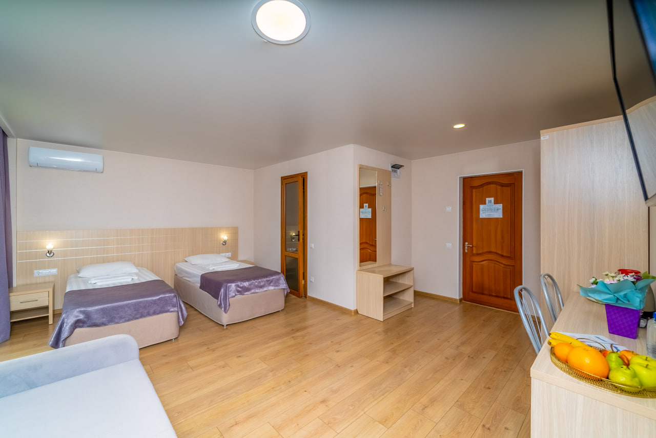 Площадь номера - 25 кв.м. 2 осн. места. 2 доп. места. Мебель: вешалка, диван, зеркало, кровати односпальные, прикроватные тумбочки, стол, стул, шкаф. Оборудование: кондиционер, телевизор, холодильник. Санузел: с душем, туалетные принадлежности. Сервис: Wi-Fi бесплатно, смена полотенец, смена постельного белья, уборка номера.